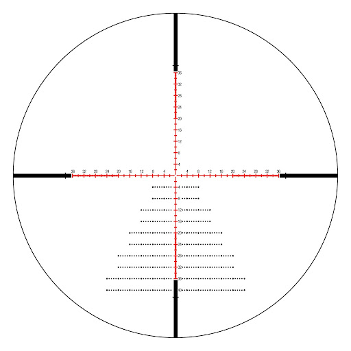 In addition to the MOA hashmarks on the main vertical and horizontal G-126 reticle, there are windage markings, too, that are laid out in a logical fashion. The first dot on the windage scales that are located at each full hash (4, 8, 12, 16, etc as marked on the reticle) is 1.6 MOA from the center of the vertical crosshair. Each dot has 0.8 MOA spacing with every 5th dot being oversized. This oversized dot will line up with the full hash mark on the horizontal crosshair. These more finely graduated subtensions can be helpful in precisely ranging a smaller target or a target found at a greater distance.